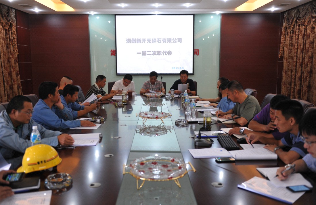 2013年9月3日,湖州新開元碎石有限公司一屆二次職代會于13:30在湖州新開院碎石有限公司會議室正式召開。此次會議由公司副總經理、工會主席戴光良主持,主要宣讀并審議通過了《湖州新開元碎石有限公司職工薪酬調整方案》、《湖州新開元碎石有限公司休息休假管理規定》、《湖州新開元碎石有限公司職工獎懲條例》、《湖州新開元碎石有限公司整紀領導小組名單》、《湖州新開元碎石有限公司安全、質量、環保清潔生產、降本節支加獎發放細則》以及《湖州新開元碎石有限公司第一批勞務派遣工轉正實施細則》。
